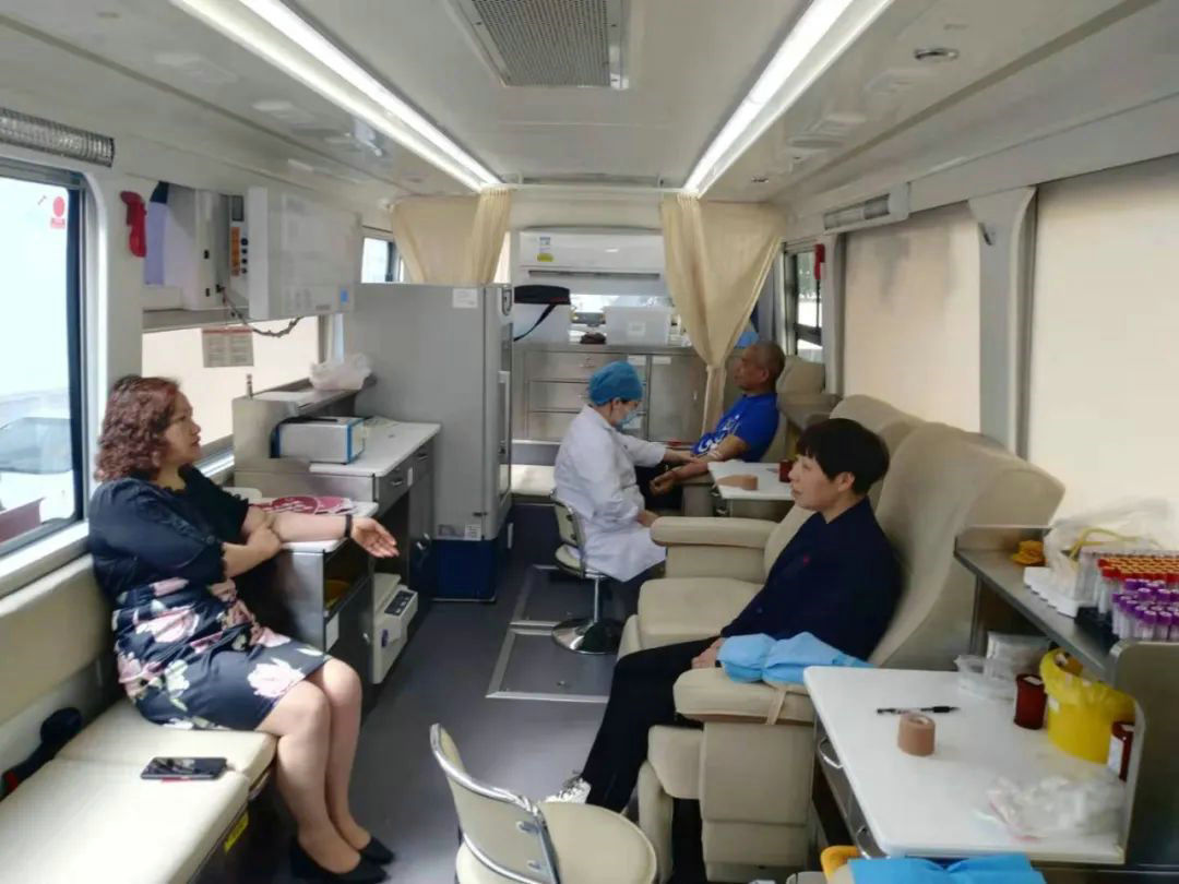 De foto toont het mobiele bloeddonatievoertuig van de Shengzhou Centrale Bloedbank